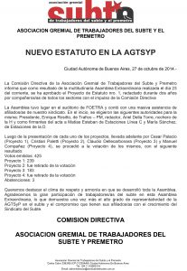 Ciudad Autónoma de Buenos Aires, 27 de octubre de 2.014.- La Asociación Gremial de Trabajadores del Subterráneo y el Premetro...