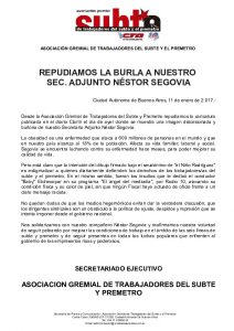 Ciudad Autónoma de Buenos Aires, 11 de enero de 2.017.- Desde la Asociación Gremial de Trabajadores del Subte y Premetro...