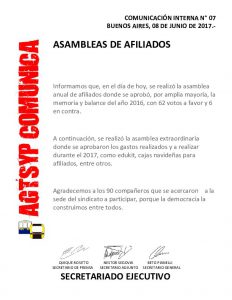 Informamos que, en el día de hoy, se realizó la asamblea anual de afiliados donde se aprobó, por amplia mayoría,...