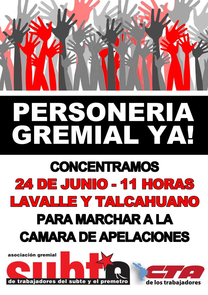 La AGTSyP convoca a marchar el miércoles 24 a las 11 a la Cámara Nacional de Apelaciones para solicitar a sus autoridades que definan las formalidades del expediente por nuestra personería gremial, lo traten y resuelvan a partir del hecho de que la apelación de la UTA es una presentación que solo trata de dilatar la obtención de la personería.