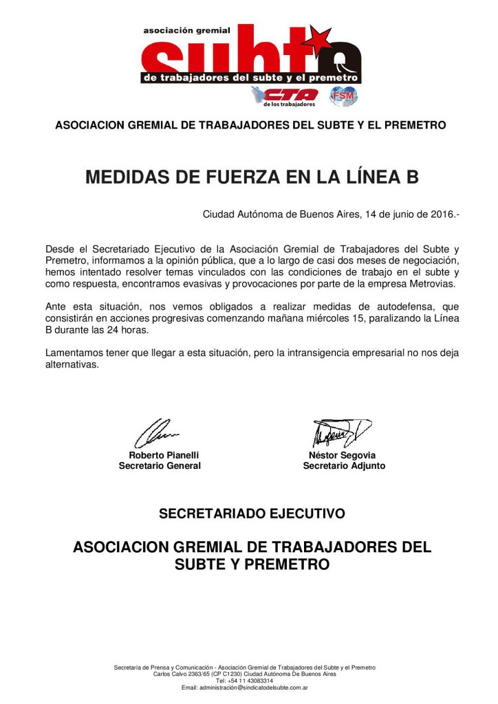 Desde el Secretariado Ejecutivo de la Asociación Gremial de Trabajadores del Subte y Premetro, informamos a la opinión pública, que a lo largo de casi dos meses de negociación, hemos intentado resolver temas vinculados con las condiciones de trabajo en el subte y como respuesta, encontramos evasivas y provocaciones por parte de la empresa Metrovias.