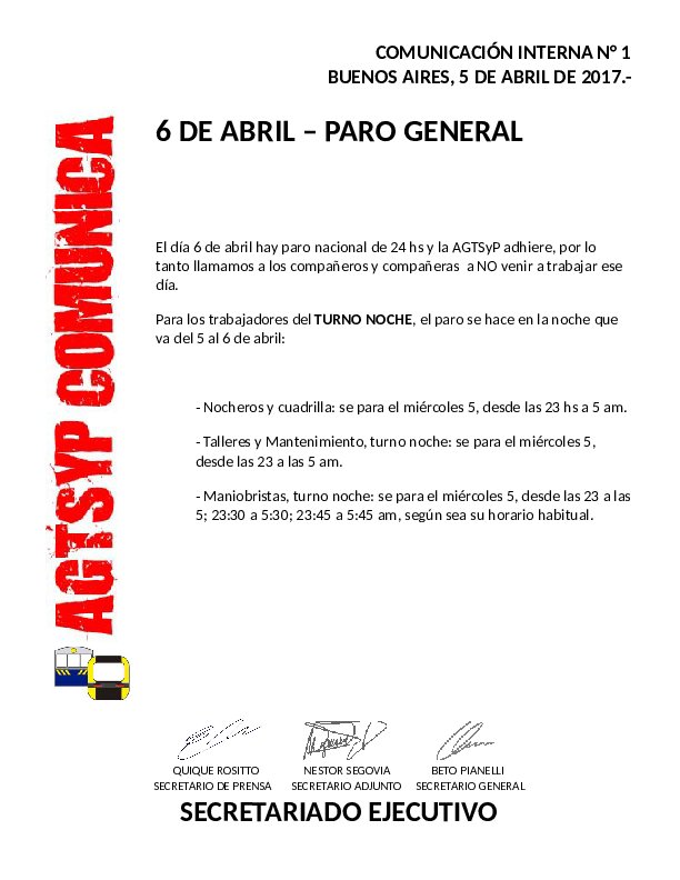 Comunicación Interna #01: 6 DE ABRIL – PARO GENERAL