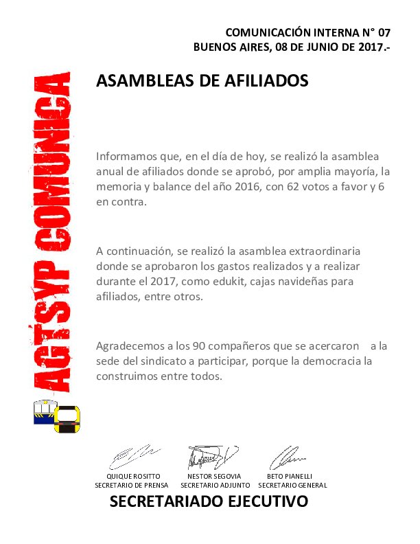 Informamos que, en el día de hoy, se realizó la asamblea anual de afiliados donde se aprobó, por amplia mayoría, la memoria y balance del año 2016, con 62 votos a favor y 6 en contra.