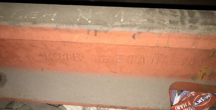 Los rieles de la extensión de 1966 tienen inscripta la leyenda “КМК имени СТАЛИНА” (“KMK im. STALINA” en alfabeto latino). La sigla KMK hace referencia al Combinado Metalúrgico de Kuznetsk (Кузнецкий металлургический комбинат). La segunda parte es la clave. La abreviación “im.” corresponde al ruso “imeni”, utilizado para indicar cuando una institución pública recibe su nombre en homenaje a alguien. En este caso, las vías de la línea E llevaban escrito que habían sido producidas en el Combinado Metalúrgico de Kuznetsk “Stalin”.