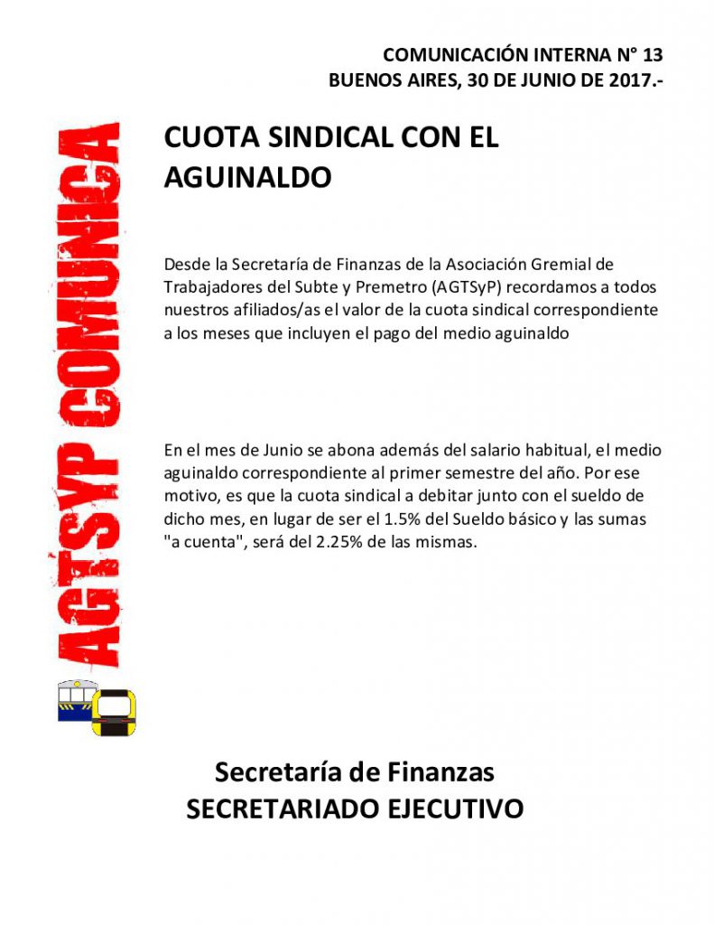 Desde la Secretaría de Finanzas de la Asociación Gremial de Trabajadores del Subte y Premetro (AGTSyP) recordamos a todos nuestros afiliados/as el valor de la cuota sindical correspondiente a los meses que incluyen el pago del medio aguinaldo.