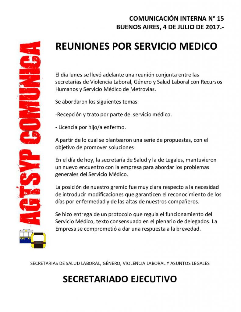 Se hizo entrega de un protocolo que regula el funcionamiento del Servicio Médico, texto consensuado en el plenario de delegados. La Empresa se comprometió a dar una respuesta a la brevedad.