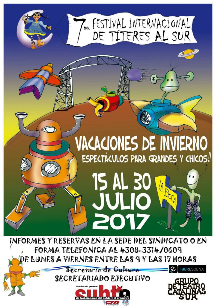 La Secretaría de Cultura de AGTSyP invita a los afiliados/as y su familia a disfrutar del 7mo Festival Internacional de Títeres al Sur que se desarrolla desde el 15 al 30 de julio en El Galpón de Catalinas del barrio de La Boca. Elencos de Argentina, España, México, Perú, Ecuador, Uruguay, Grecia, Suiza, Francia y Noruega se harán presente con espectáculos de títeres de guante, de mesa, de medio cuerpo, de varilla, marionetas y teatro de sombras entre otros.