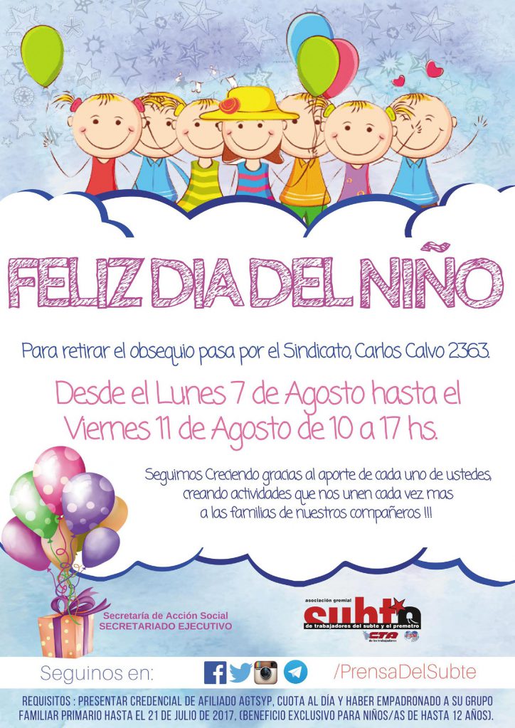 La Secretaría de Acción Social de la AGTSyP invita a los afiliados/as a la ya tradicional entrega de la bolsita de dulces para el Día del Niño/a.