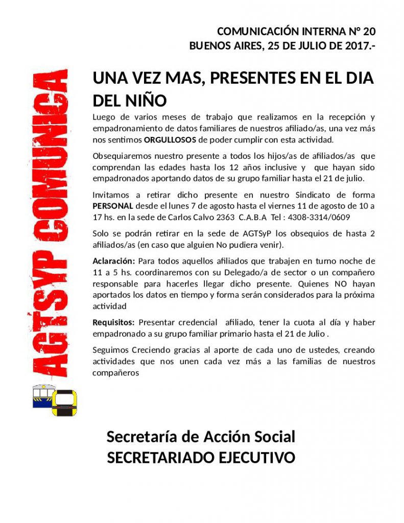 Invitamos a retirar dicho presente en nuestro Sindicato de forma PERSONAL desde el lunes 7 de agosto hasta el viernes 11 de agosto de 10 a 17 hs. en la sede de Carlos Calvo 2363 C.A.B.A Tel : 4308-3314/0609