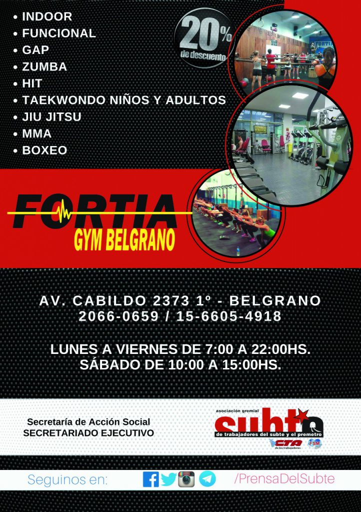 La Secretaría de Acción Social de AGTSyP ofrece un nuevo beneficio a los afiliados/as. Se trata de 20% de descuento en el gimnasio Fortia de Belgrano. Entre las actividades que ofrece están: