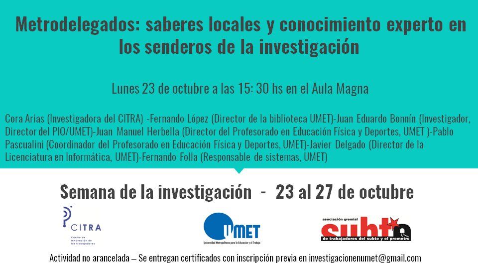 Representando a la AGTSyP, el secretario de Cultura, Jorge “Tano” Pisani, estuvo presente el lunes en la Universidad Metropolitana (UMET) donde se presentaron los trabajos que realizaron los investigadores del Centro de Innovación de los Trabajadores (CITRA) en el marco de la Semana de la Investigación de la casa de estudios.