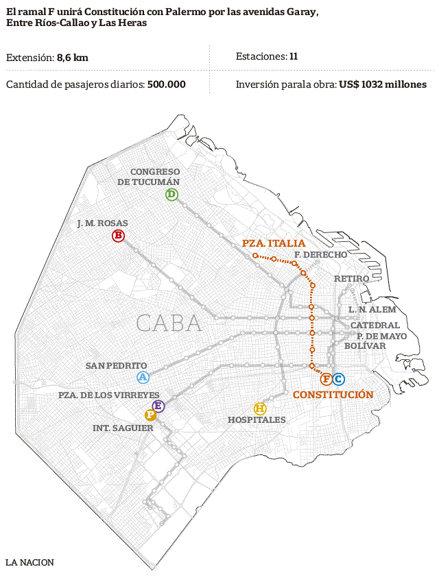 Los otros considerados fueron la G (entre Retiro y Villa del Parque, a través del Cid Campeador) y la I (desde la estación Emilio Mitre hasta Plaza Italia y de allí a la Ciudad Universitaria). ¿Por qué la Ciudad decidió avanzar primero con la F? “La realidad y la experiencia internacional nos marcan que las nuevas líneas deben correr por zonas densas de la ciudad, para generar una relación multimodal con otros medios, como el Metrobus y el sistema Ecobici”, explicó a La Nación Franco Moccia, ministro de Desarrollo Urbano y Transporte porteño.