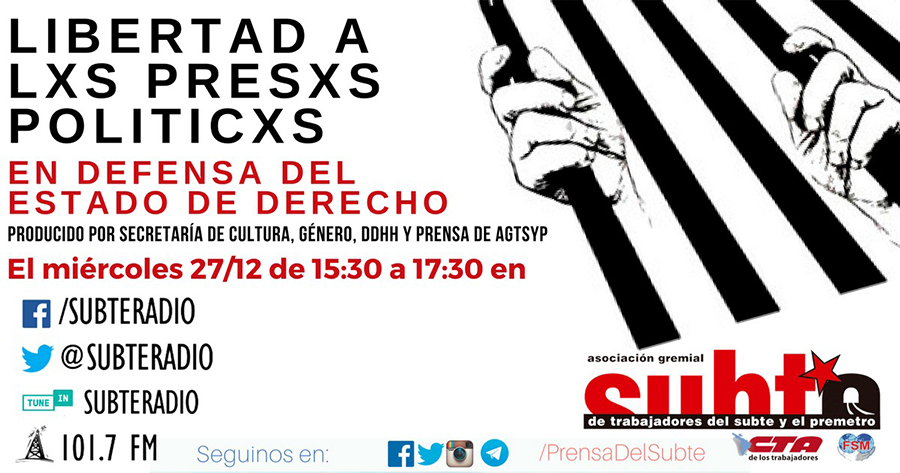 Este miércoles 27/12 a las 15:30 se realizará un programa especial de Acoplando Radial en conjunto con las secretarías de Prensa y Comunicación, Derechos Humanos y Género cuyo tema principal es pedir la libertad de todo/as los/as presos/as políticos que fueron encarcelados en dudosos procedimientos judiciales durante el gobierno de Mauricio Macri, contrario a lo que plantea el Estado de Derecho.