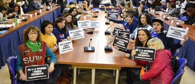 La agenda de los feminismos volvió al Congreso este martes. En una plenaria de comisiones de Trabajo y de Familia, Mujer, Niñez y Adolescencia, en el Anexo de la Cámara de Diputadxs, comenzó a debatirse el proyecto de Ley de equidad de género e igualdad de oportunidades en el mundo del trabajo. La propuesta del Poder Ejecutivo fue rechazada por diputadxs—sobre todo, de extracción sindical— y principalmente por las mujeres sindicalistas de diversas centrales sindicales y de la economía popular. Así se lo hicieron saber a la directora del Instituto Nacional de las Mujeres, Fabiana Túñez y a Ernesto Leguizamón, jefe de Gabinete del (ex) Ministerio de Trabajo. Ambxs fueron los mascarones de proa elegidos por el gobierno para explicar los alcances del proyecto ante la mirada de más de cincuenta mujeres con pecheras sindicales y carteles en los que se leía “No a la reforma laboral encubierta”. Eso es lo que sostienen las mujeres nucleadas en la CGT, la CTA, la CFT, la CTEP y la CNCT: que la ley que pretende sancionar Cambiemos es, en realidad, la forma que encontraron para concretar la reforma laboral que no pudieron sancionar en diciembre pasado.