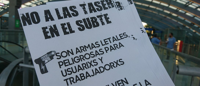 Durante la tarde del martes 5 de febrero, 50 compañerxs del Subte y otras organizaciones participaron de la volanteada convocada por el sindicato para difundir entre lxs usuarixs el peligro de las pistolas Taser que el gobierno planea utilizar en el subterráneo.